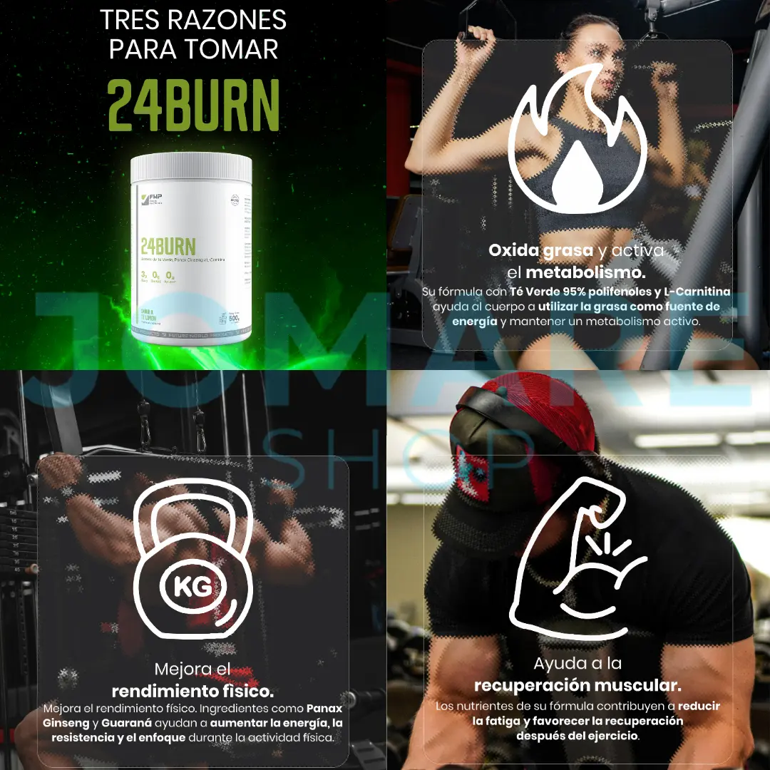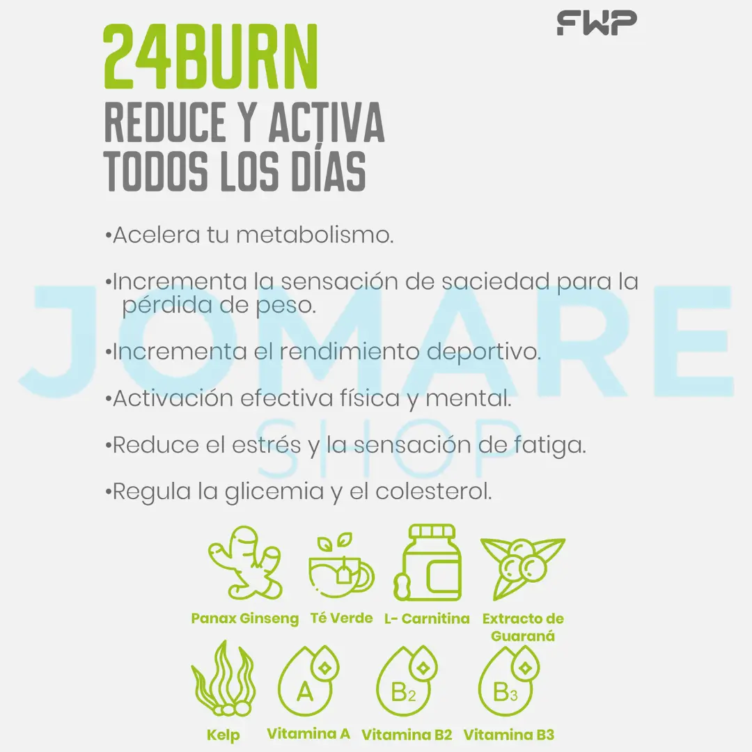 24BURN es un suplemento diseñado para activar el metabolismo, aumentar la energía y apoyar la quema de grasa de forma natural. Ideal para quienes buscan controlar su peso sin perder rendimiento ni enfoque.