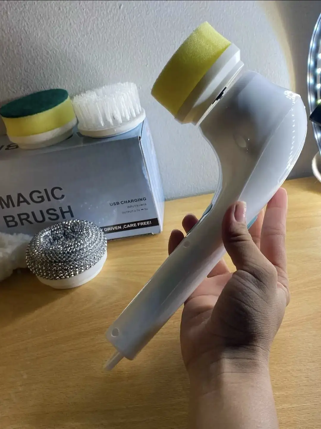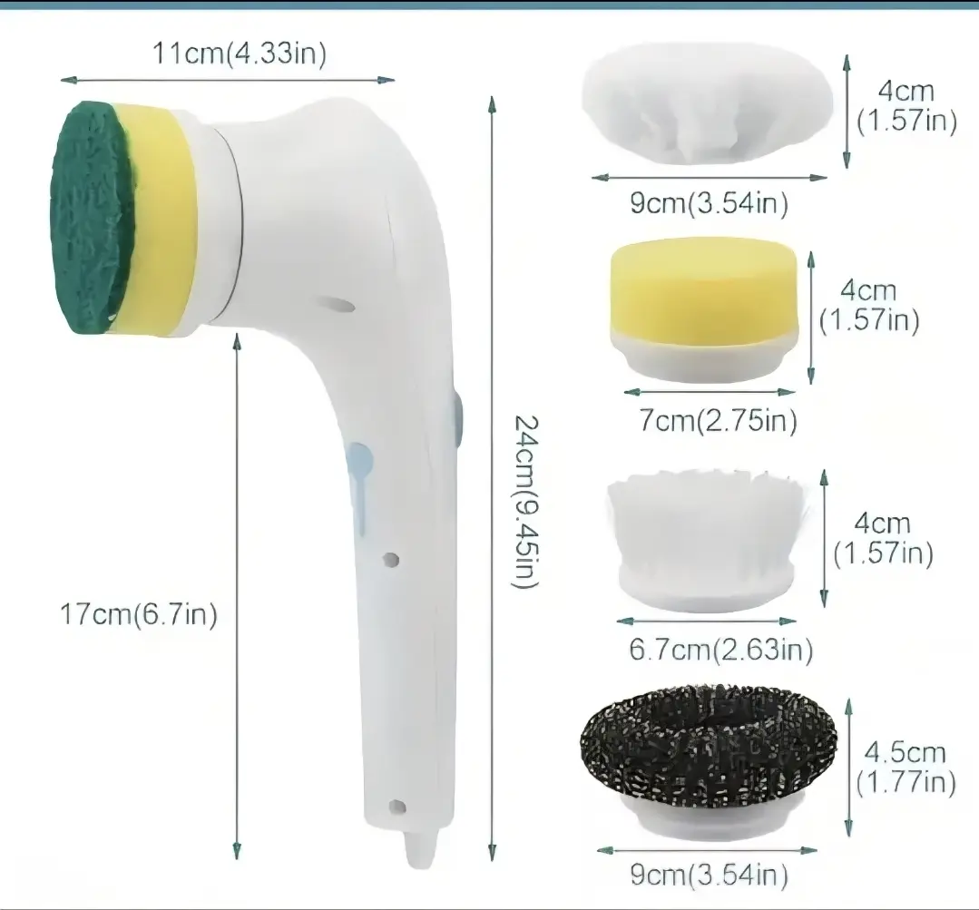 - Incluye 5 cabezales: esponja, lana de acero, pulidor, microfibra y fibra abrasiva