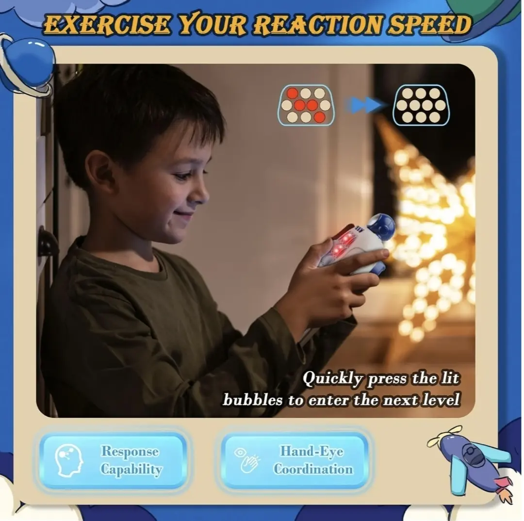 Sus burbujas activan luces y sonidos al presionarlas, creando un feedback inmediato que motiva a seguir jugando. Además, cuenta con volumen ajustable e incluso la opción de jugar en silencio, perfecto para usar en casa, viajes o momentos de espera. Fabricada en ABS y silicona de alta calidad, es liviana, resistente y segura para el uso diario.