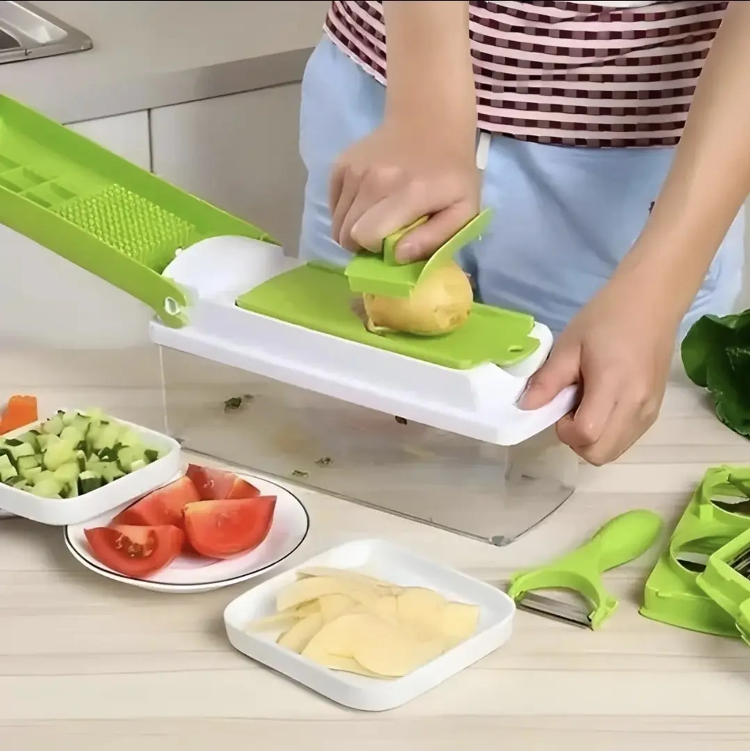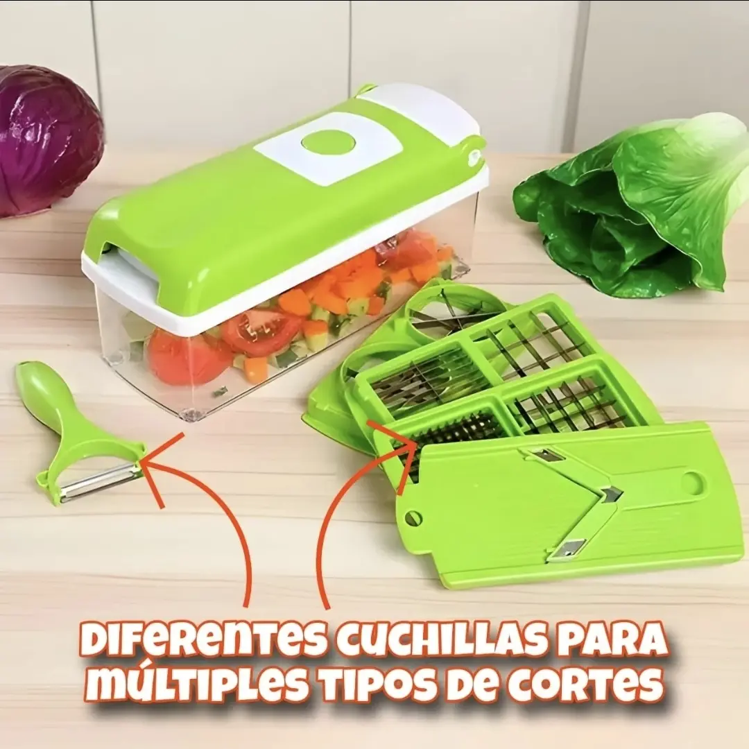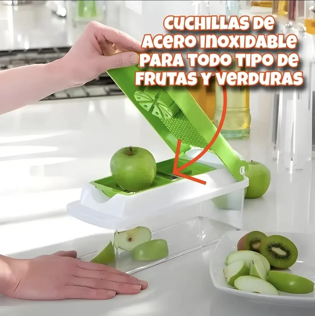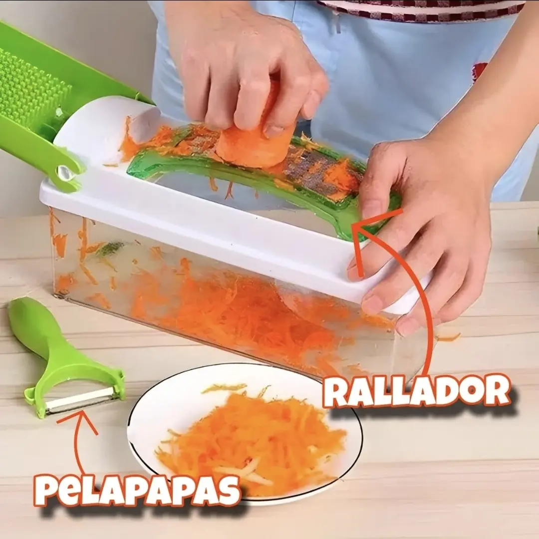 Simplificá tu cocina con esta mandolina multifunción 12 en 1, diseñada para lograr cortes rápidos, precisos y totalmente uniformes. Gracias a su sistema de cuchillas intercambiables de acero inoxidable, podés obtener hasta 22 estilos de corte: rodajas finas o gruesas, cubos, bastones, juliana, rallado fino y grueso, entre otros.