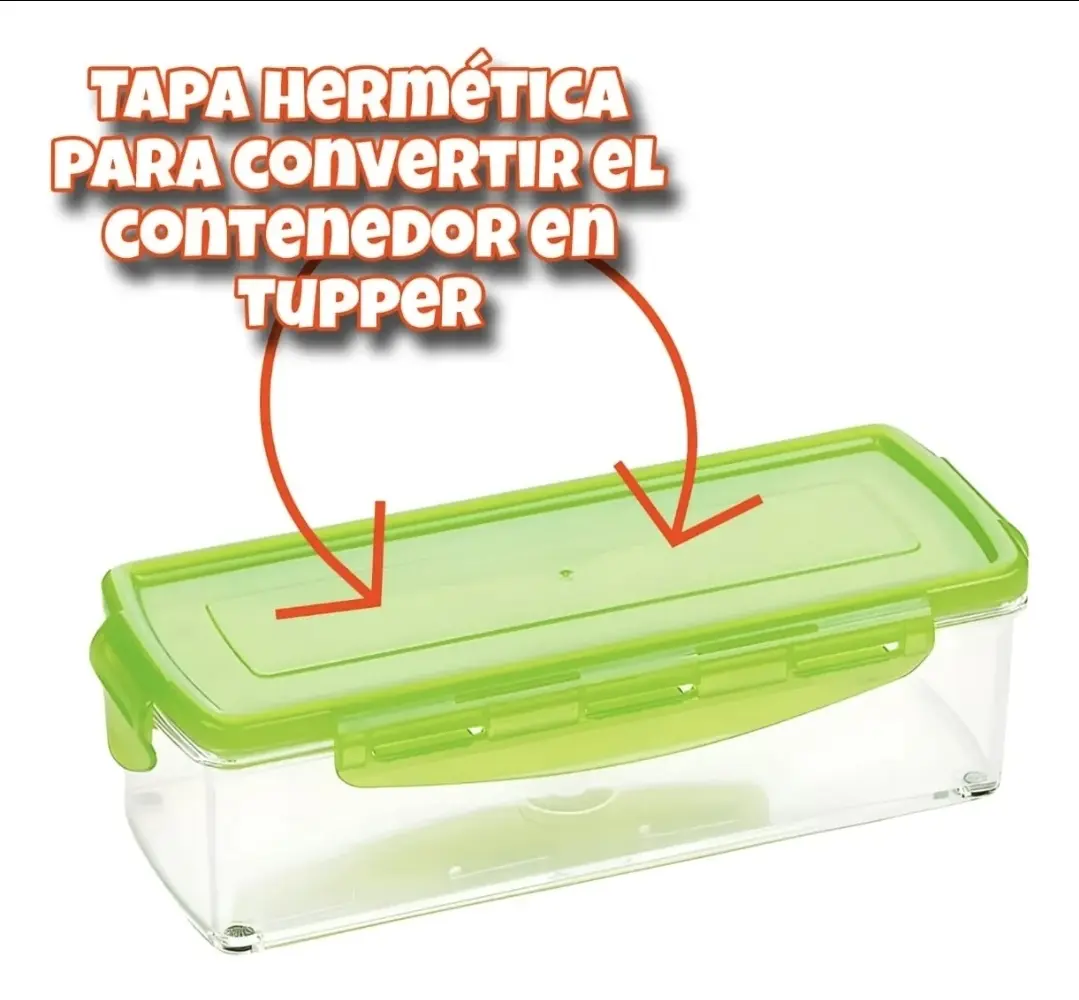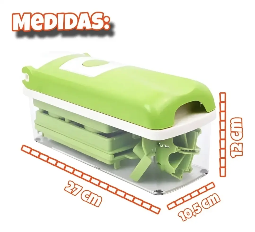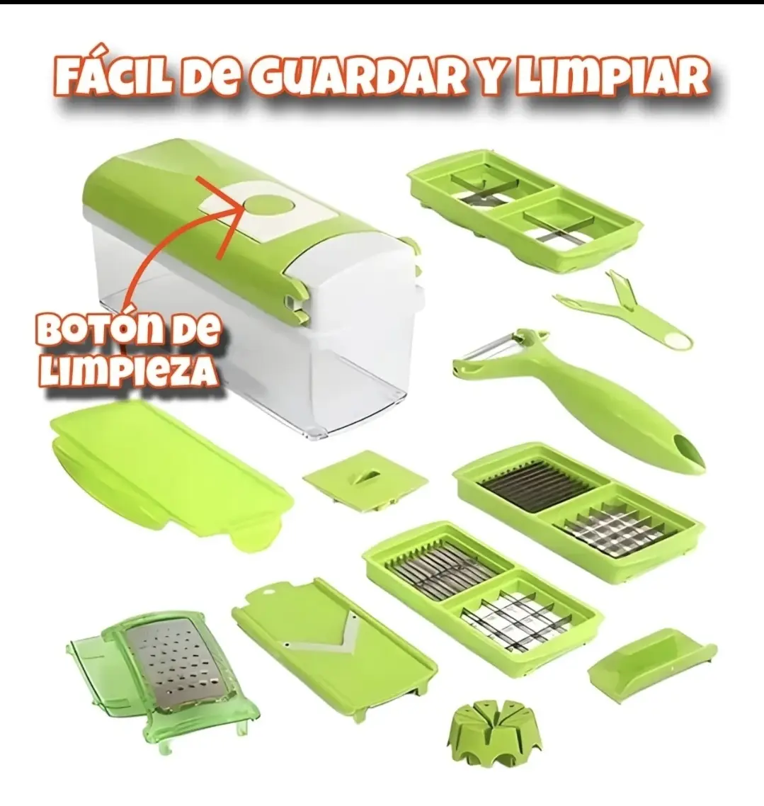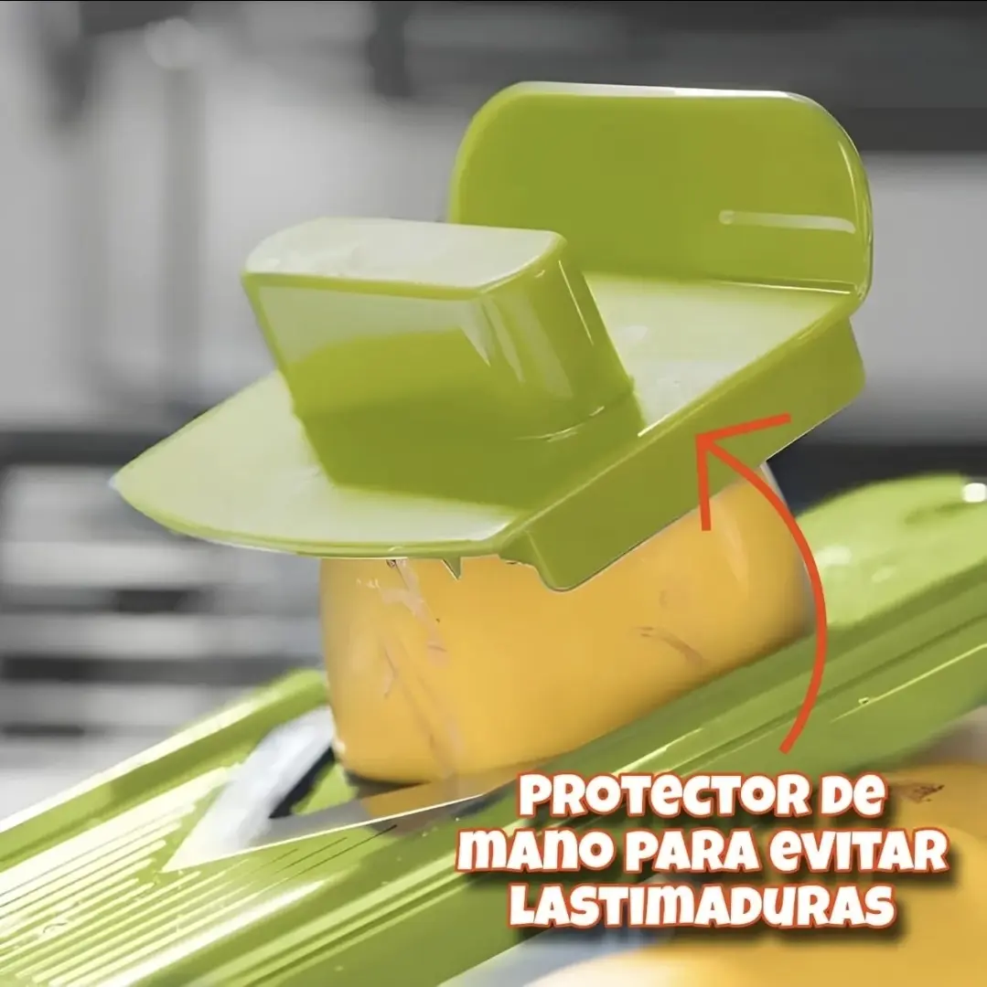 Incluye un recipiente contenedor para mantener la mesada limpia mientras trabajás, además de un pelador y accesorios de seguridad que te permiten cortar sin riesgos. Ideal para frutas, verduras y cualquier preparación donde necesitás velocidad y prolijidad.