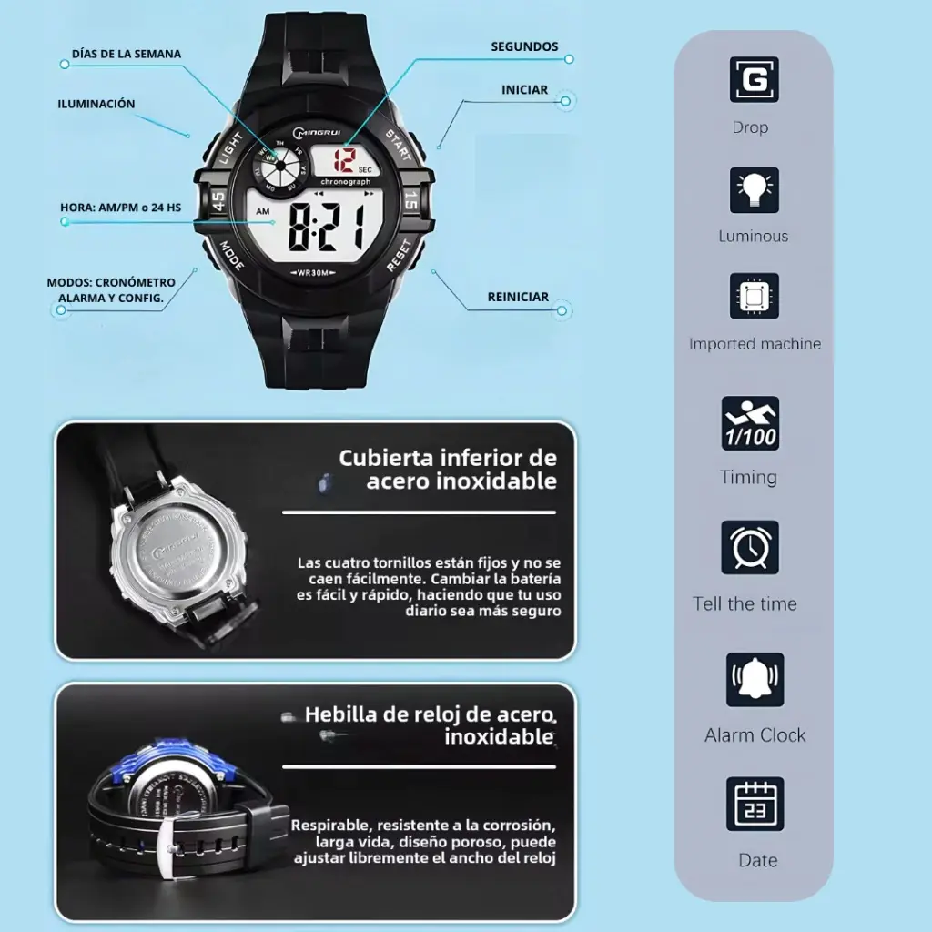 Diseñado para acompañarte en cada momento, el Reloj Deportivo Mingrui combina estilo y rendimiento. Ideal para uso diario o actividades al aire libre, ofrece precisión, comodidad y resistencia en un diseño contemporáneo.