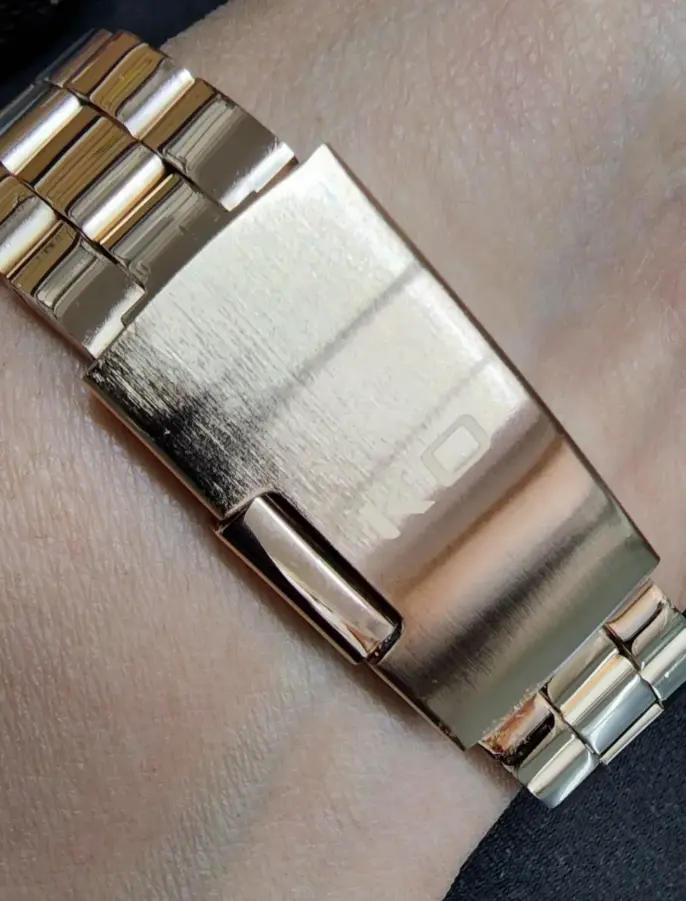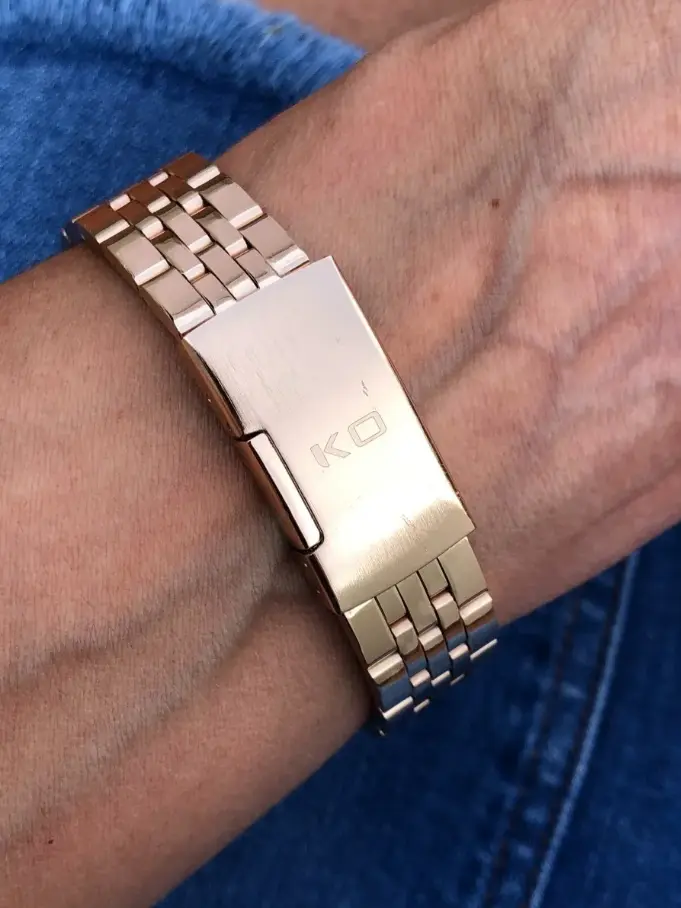 • Pulsera metálica en oro rosa: resistente, ajustable y con acabado brillante.