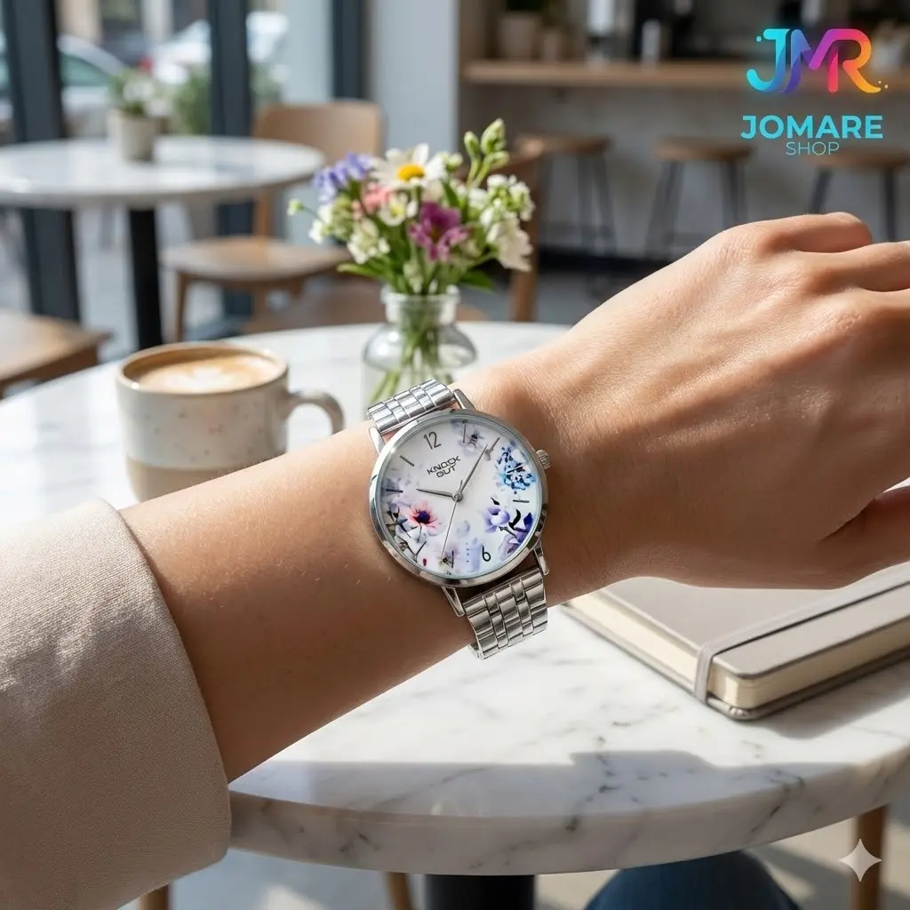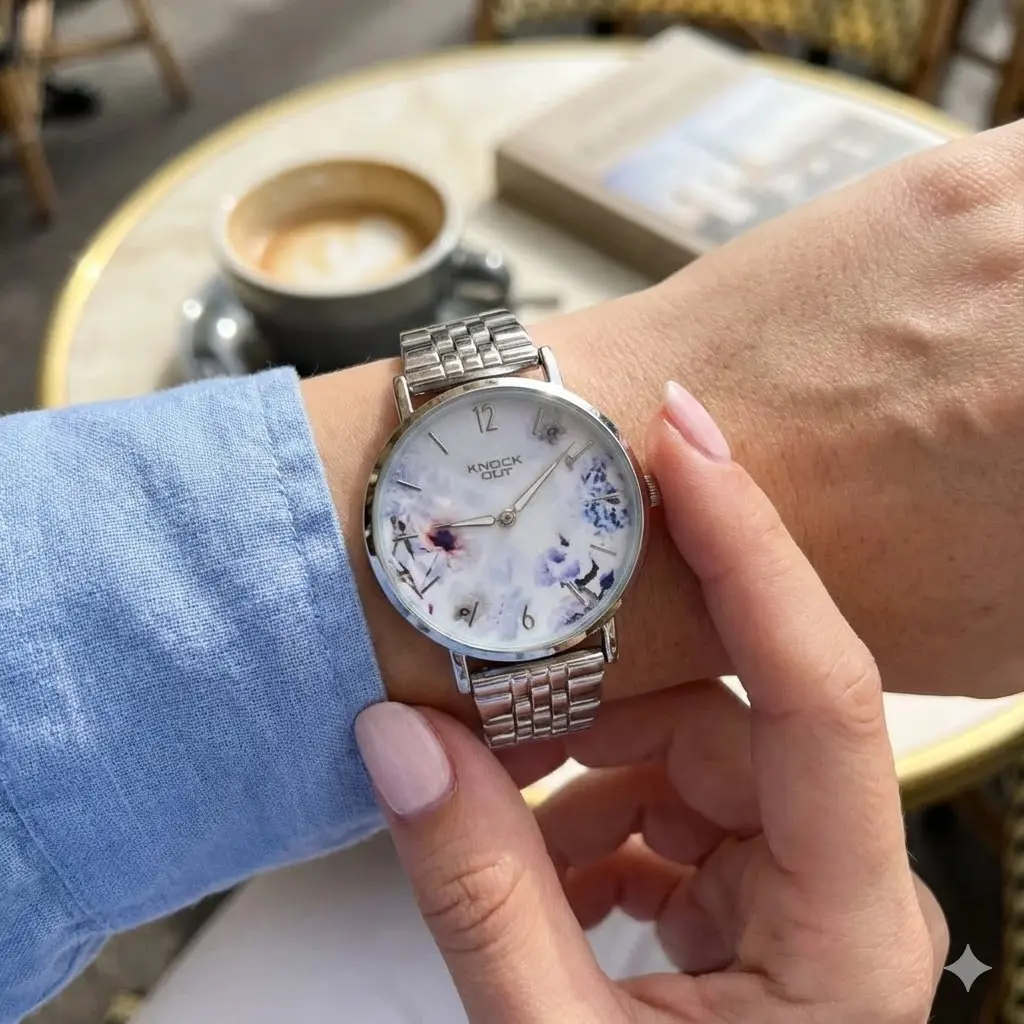 El Reloj Knock Out es ese detalle sutil que transforma cualquier look. Su pulsera metálica plateada aporta una sensación de frescura y elegancia, mientras que su esfera con delicados motivos florales suma un toque de originalidad y feminidad que no pasa desapercibido.