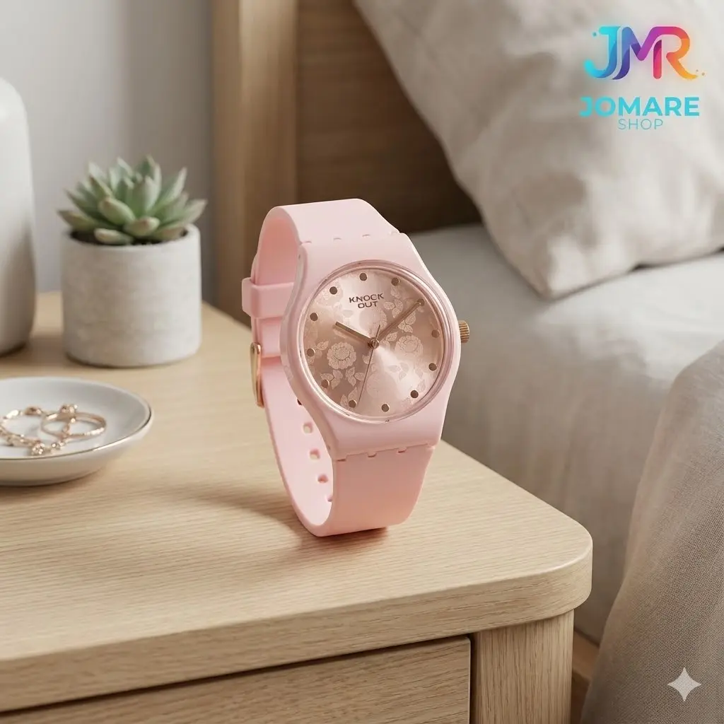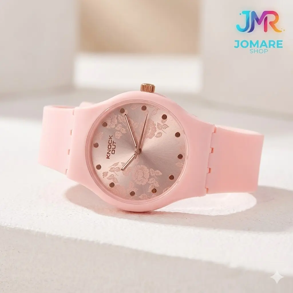El Reloj Knock Out modelo 8442-5 es ideal para mujeres que buscan un accesorio cómodo, liviano y con un diseño alegre para el uso diario. Su malla de silicona rosa aporta suavidad y confort, mientras que el fondo decorado suma un detalle visual atractivo y femenino.