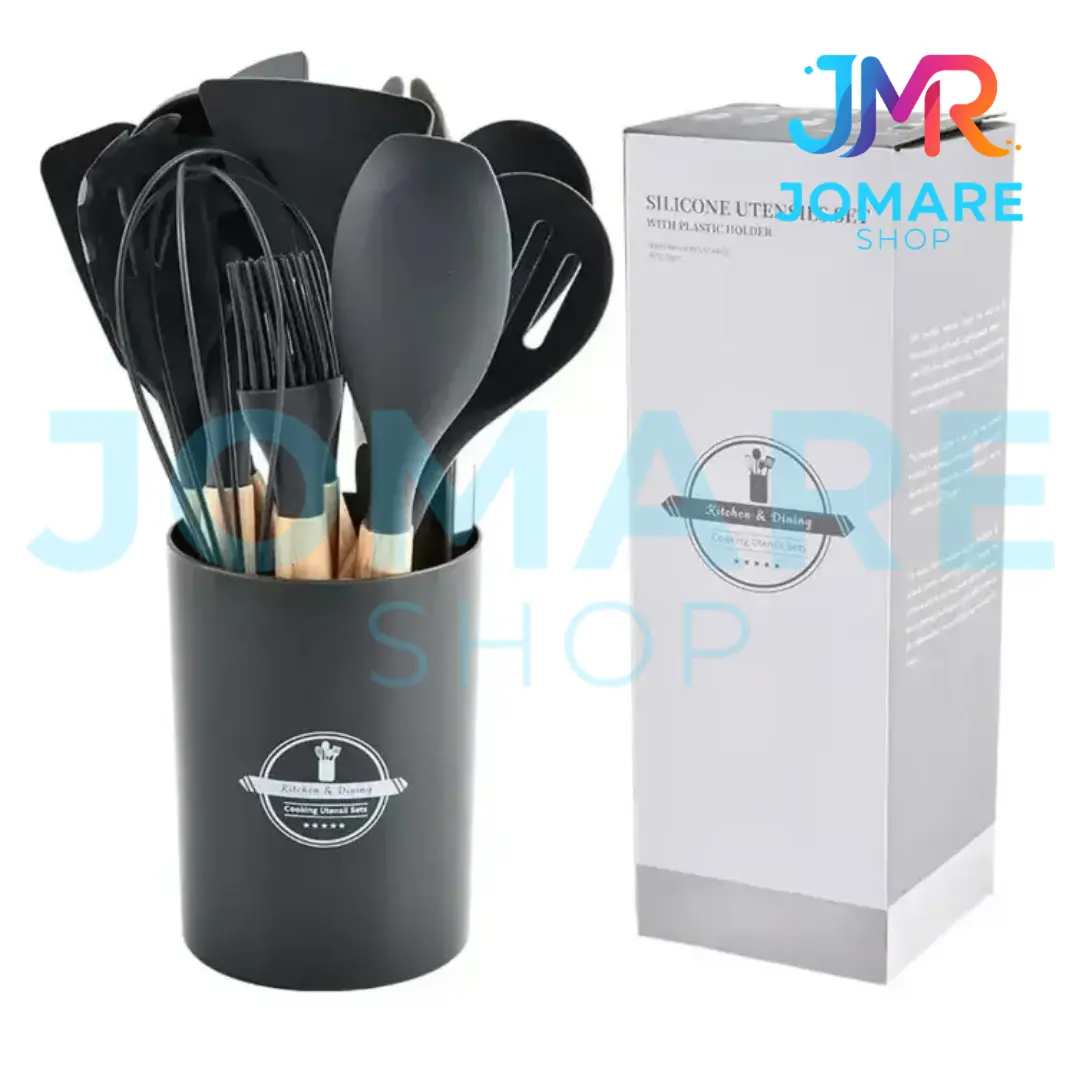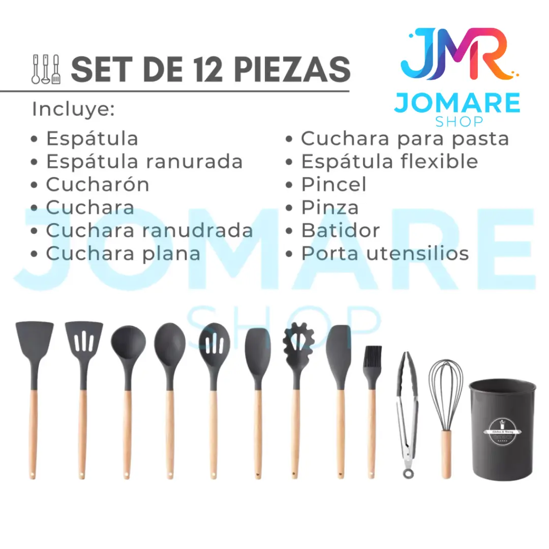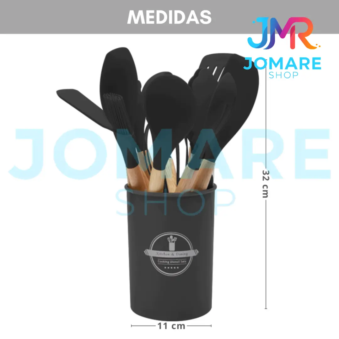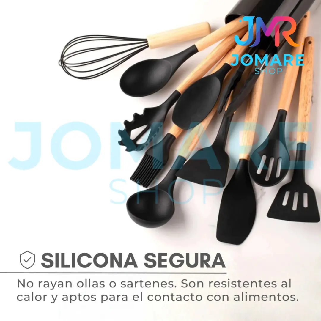 Organizá y renová tu cocina con el Juego de utensilios de cocina x12 de silicona con mangos de madera 🍳